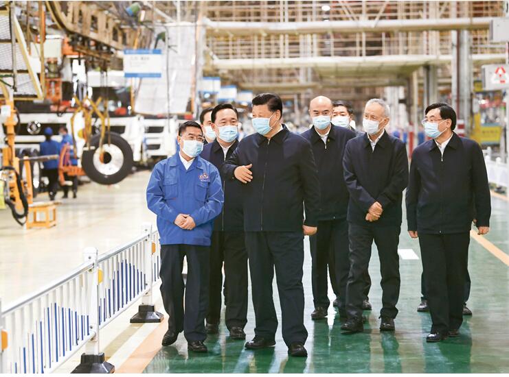 2020年4月20日至23日,中共中央总书记、国家主席、中央军委主席习近平在陕西考察。这是4月22日,习近平在陕西汽车控股集团有限公司总装车间察看生产线,了解产品研发、生产、销售和复工复产情况。 新华社记者 谢环驰/摄