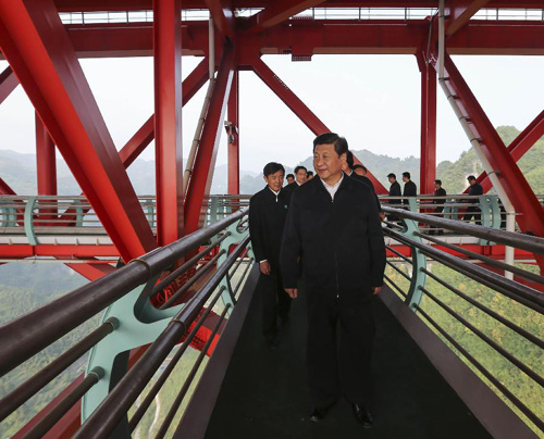 2013年11月3日至5日,中共中央总书记、国家主席、中央军委主席习近平在湖南考察。这是3日下午,习近平来到位于湖南吉首市的矮寨特大悬索桥考察。新华社记者 兰红光摄