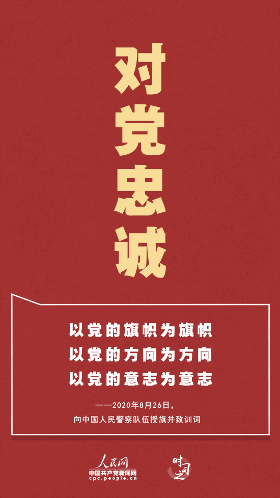 对党忠诚——“坚定的理想信念是政法队伍的政治灵魂。”红色,是中国人民警察警旗的主色调,也是忠诚的颜色。对党忠诚、听党指挥,是人民警察队伍代代相传的政治基因。新时代,人民警察队伍要坚持党的绝对领导,增强“四个意识”、坚定“四个自信”、做到“两个维护”,确保绝对忠诚、绝对纯洁、绝对可靠。