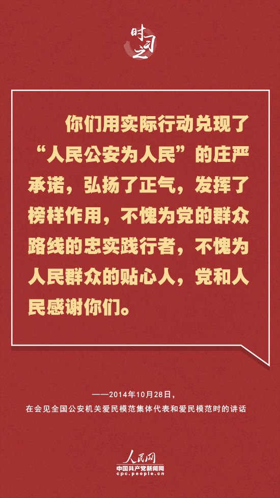 对人民警察这支和平时期“牺牲最多、奉献最大”的特殊队伍,习近平多次表达感谢——“你们用实际行动兑现了‘人民公安为人民’的庄严承诺,弘扬了正气,发挥了榜样作用,不愧为党的群众路线的忠实践行者,不愧为人民群众的贴心人,党和人民感谢你们。”“正是有了你们的辛勤付出和流血牺牲,才换来了广大人民群众的安宁和幸福。你们不愧为党和人民的忠诚卫士,党和人民感谢你们。”“平时你们就是风里来、雨里去,战严寒、斗酷暑,‘白加黑’‘五加二’。和平时期最辛苦最劳累、付出牺牲贡献最大的是公安干警。党和人民都感谢你们!”