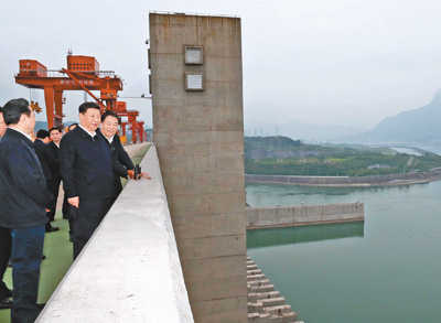 4月26日下午,中共中央总书记、国家主席、中央军委主席习近平在武汉主持召开深入推动长江经济带发展座谈会并发表重要讲话。这是座谈会前,习近平于24日下午在三峡大坝坝顶察看三峡工程和坝区周边生态环境。