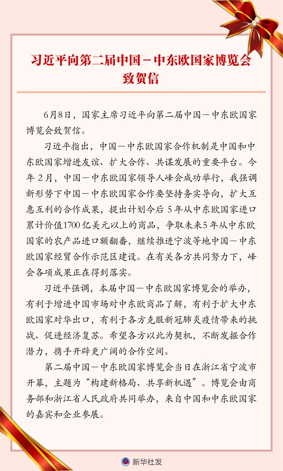 新华社北京6月8日电 6月8日,国家主席习近平向第二届中国-中东欧国家博览会致贺信。