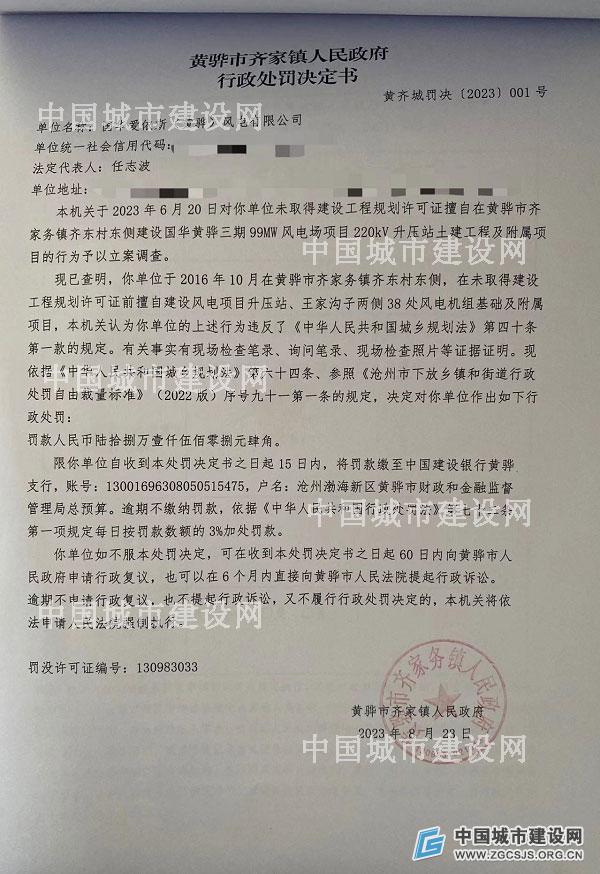 文号“黄齐城罚决〔2023〕001号”行政处罚决定书显示,国华爱依斯(黄骅)风电有限公司于 2016 年 10月在黄骅市齐家务镇齐东村东侧,在未取得建设工程规划许可证前擅自建设风电项目升压站、王家沟子两侧38处风电机组基础及附属项目,违反了《中华人民共和国城乡规划法》第四十条第一款的规定。
