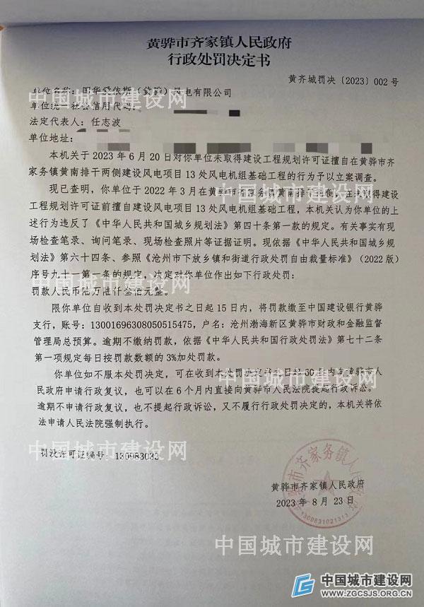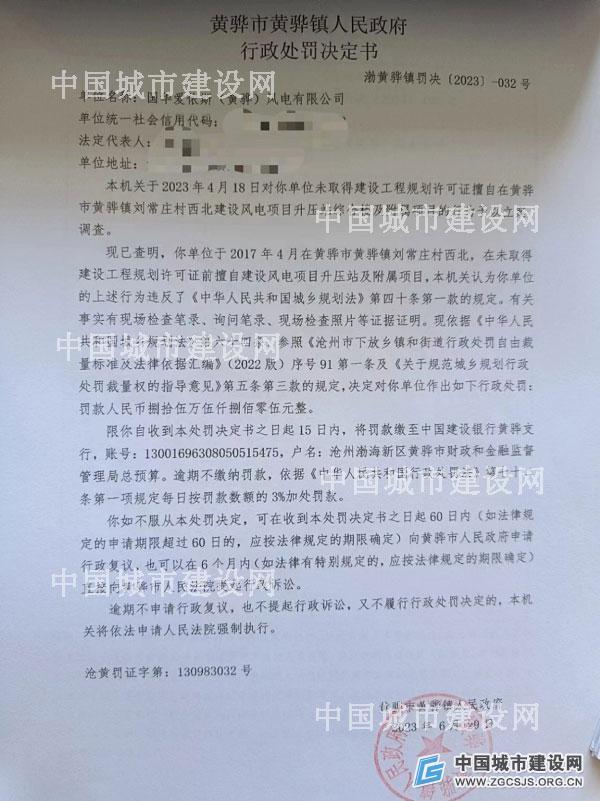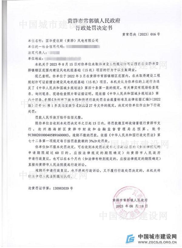 文号“黄常罚决〔2023〕016号”行政处罚决定书显示,国华爱依斯(黄骅)风电有限公司于2022年3月在黄骅市常郭镇辖区范围内,在未取得建设工程规划许可证前擅自建设风电机组基础(15机)项目,违反了《中华人民共和国城乡规划法》第四十条第一款的规定。