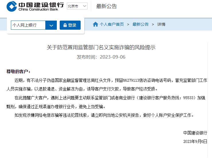 央视网消息:9月6日,中国建设银行在官网发布风险提示,近期,有不法分子伪造国家金融监督管理总局红头文件,预留66279113信访咨询电话号码,冒充监管部门工作人员实施诈骗,以退款清退、资金解冻为由,诱导客户支付欠款,导致客户经济受损。