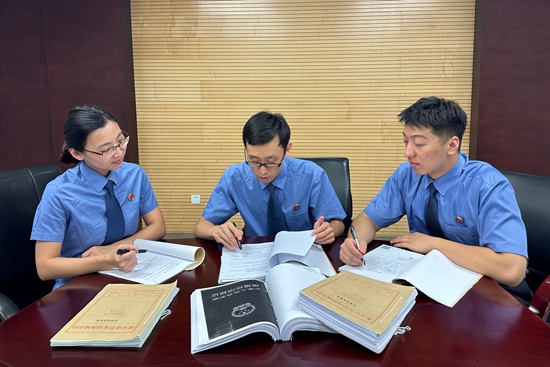 北京市西城区人民检察院第二检察部检察官正在研讨一起涉嫌洗钱犯罪案件。彭聪(左),袁硕(中)。受访者供图
