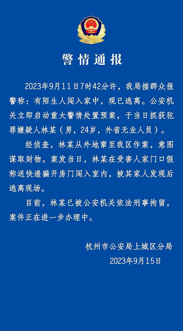 央视网消息:据“上城警方”公众号消息,9月15日,杭州公安局上城分局发布警情通报,9月11日7时42分许,接群众报警称:有陌生人闯入家中,现已逃离。公安机关立即启动重大警情处置预案,于当日抓获犯罪嫌疑人林某(男,24岁,外省无业人员)。经侦查,林某从外地窜至我区作案,意图谋取财物。案发当日,林某在受害人家门口假称送快递骗开房门闯入室内,被其家人发现后逃离现场。目前,林某已被公安机关依法刑事拘留,案件正在进一步办理中。