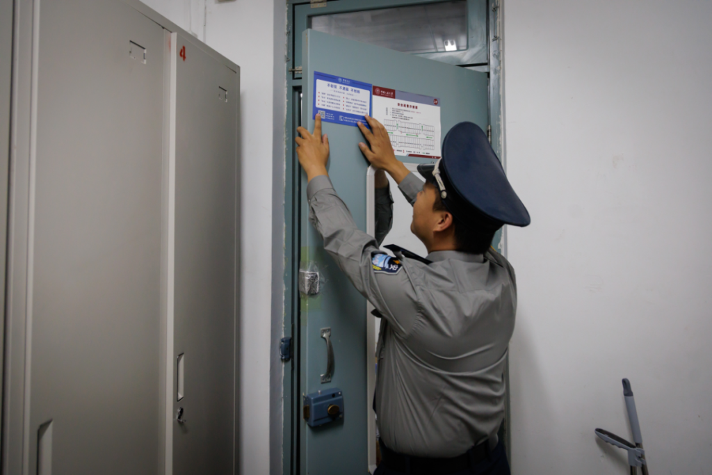 图为人大党委保卫部(处)工作人员为新生宿舍张贴“反诈提示图”