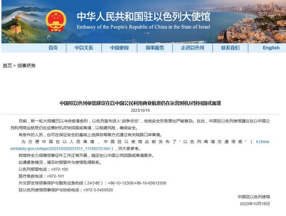 为方便中国在以人员离境,中国驻以使馆此前发布了“以色列离境交通信息”(il.china-embassy.gov.cn/lsqw/202310/t20231011_11159370.htm),供大家参考。