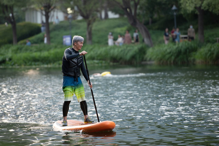 来到燕莎桥西,程序员张渊佳的衣服还滴答着河水。打去年夏天,发现亮马河上有了桨板、皮划艇,他便经常利用空闲时间从10公里外的西土城赶来。“以前户外运动只能去郊区,现在只要有时间,就赶来划个把小时,在繁忙都市享受‘野趣’”。