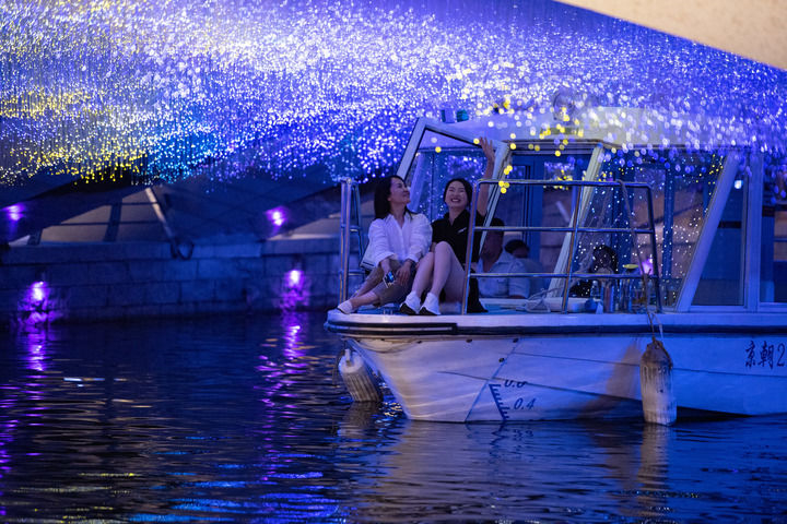 人们乘坐北京亮马河游船经过被装点成“星空”的好运桥(6月16日摄)。
