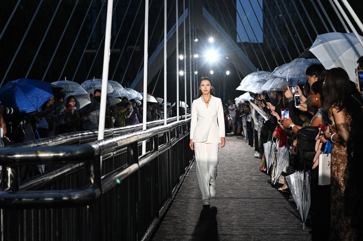 在北京亮马河友谊桥上,一场名为“型走亮马河”的国际时装秀在雨夜中上演(7月27日摄)。