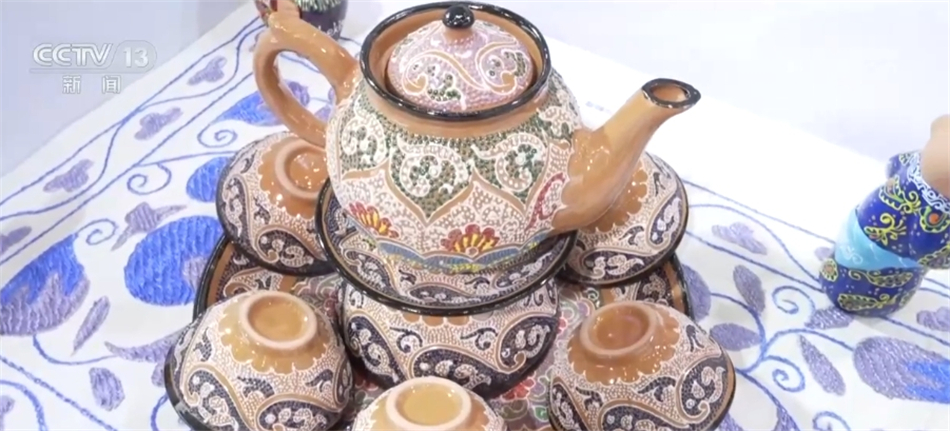 乌兹别克斯坦客商 张聪:这(茶具)是乌兹别克斯坦的非物质文化遗产产品,中国的文化里面倒茶是七分满,我们乌兹别克人倒茶是五分满或者三分满,这个茶给你倒得越来越少,说明我越来越尊重你。