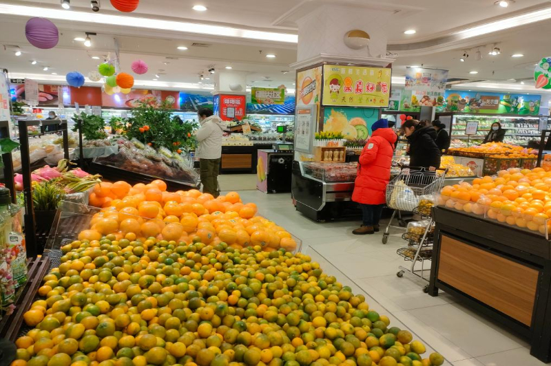 图为哈尔滨哈尔信超市内,蔬菜、水果供应充足。新华社记者 朱悦 摄