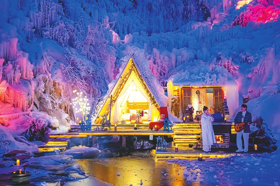 连日来,众多市民游客来到济南九如山,与形态各异的冰瀑、冰挂和奇峰峭壁亲密邂逅。置身其中,如同来到了冰雕玉砌的童话世界。时下,冰瀑节正在火热进行中,冰上露营、冰瀑下围炉煮茶、雪地摩托、雪地坦克、雪地烟花、雪地篝火等十余项冰雪娱乐项目如火如荼,冰雪游成为济南冬旅一道亮丽的风景线。 (记者吕传泉 通讯员王红娟摄)