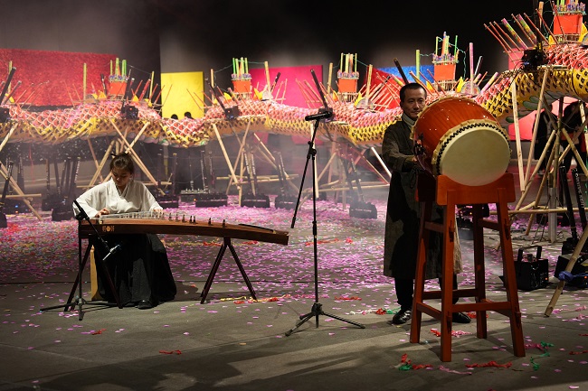 “这回的跨界艺术现场,我们使用了中国隋唐时期仪式用的大鼓(太鼓)、簧(口弦琴)、古筝以及大自然声音的采样氛围形成通达的沉浸的艺术现场。以传统文化的当代融合多元的表达形式,自然而然地呈现龙文化之气韵。”音乐总监、国际音乐艺术家陈志鹏介绍。