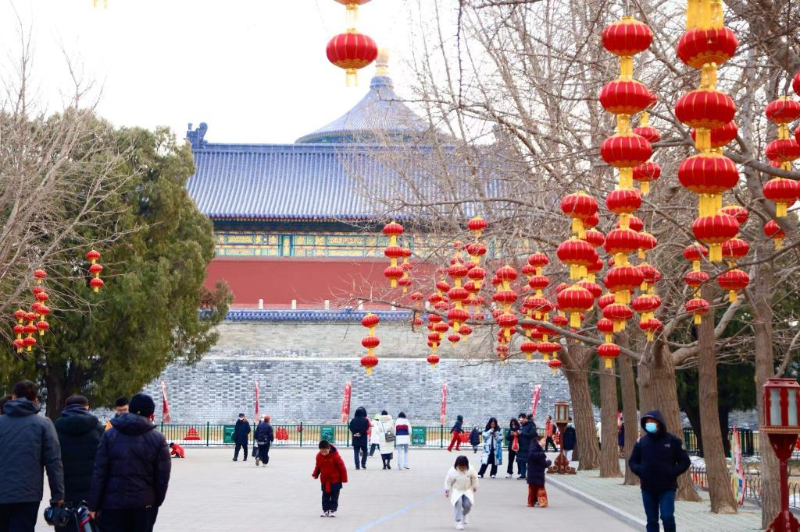 春节将至,步入天坛公园,以祈年殿为主要元素的红色道旗迎风飘展,悬挂的各式灯笼、中国结与古建完美融合,围栏上配以祈年殿及“福”字造型为装饰,处处洋溢着红火热闹的节日气氛。