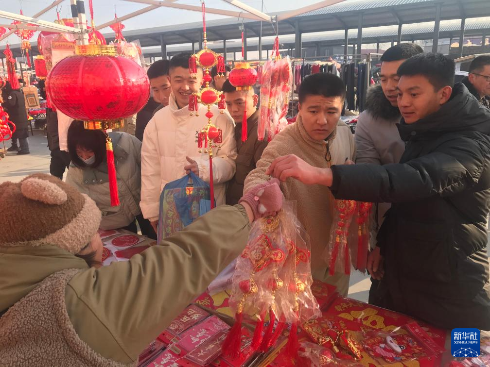河北省秦皇岛市北戴河区的牛头崖大集赶集日,熙熙攘攘的人群中,叫卖声、砍价声此起彼伏。“每副春联寓意都好,挂起来保准喜庆。”62岁的马新华将春联和灯笼成排挂在摊位上,赶集的人们在摊位前边看边挑选。