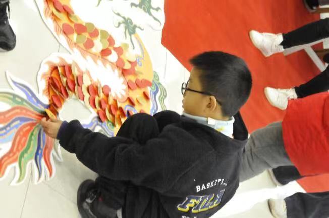 “穿越千年,寻找龙的踪迹”。在寻龙探宝小组游戏环节,亲子家庭展开了一场寻找龙元素的“大冒险”活动。从龙头到龙鳞,从龙袍到龙纹,大家分别寻找古建筑里的龙、文物记载里的龙、西游记里的龙、青浦博物馆的龙。相应的龙元素,完整拼出了“九龙壁图”,赢取了“非遗宝藏”,每位小朋友得到“一片许愿龙鳞”,写下新春的美好愿望,并贴在龙身上,完成了“双龙戏珠”展示板。