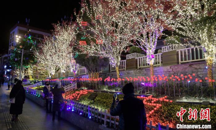 1月16日,新春将至,四川甘孜康定市街头大型迎春彩灯、霓虹灯投用,夜幕下绚烂的光影吸引了不少民众目光。