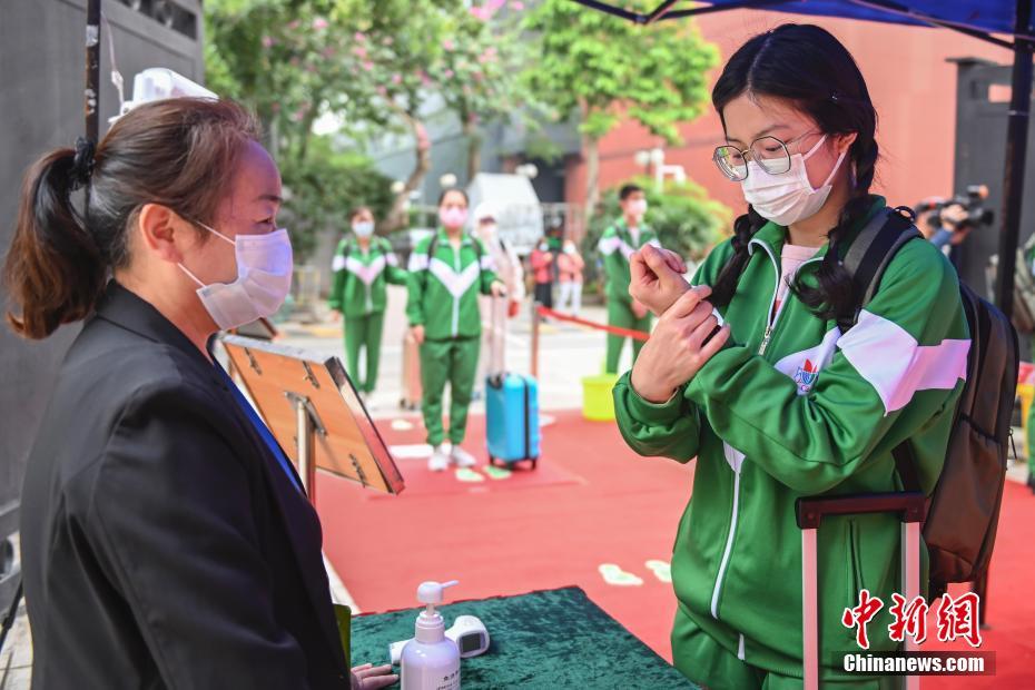 4月14日,广州育才实验学校的工作人员在复课疫情防控演练上为入校学生消毒。演练分为师生进入校门晨检、晨检临时隔离、午检发现病例、食堂就餐、发热学生接诊处理五个场景。根据广东省新冠肺炎疫情防控指挥部要求,全省各级各类学校学生自4月27日起分期、分批、错峰返校。 中新社记者 陈骥旻 摄