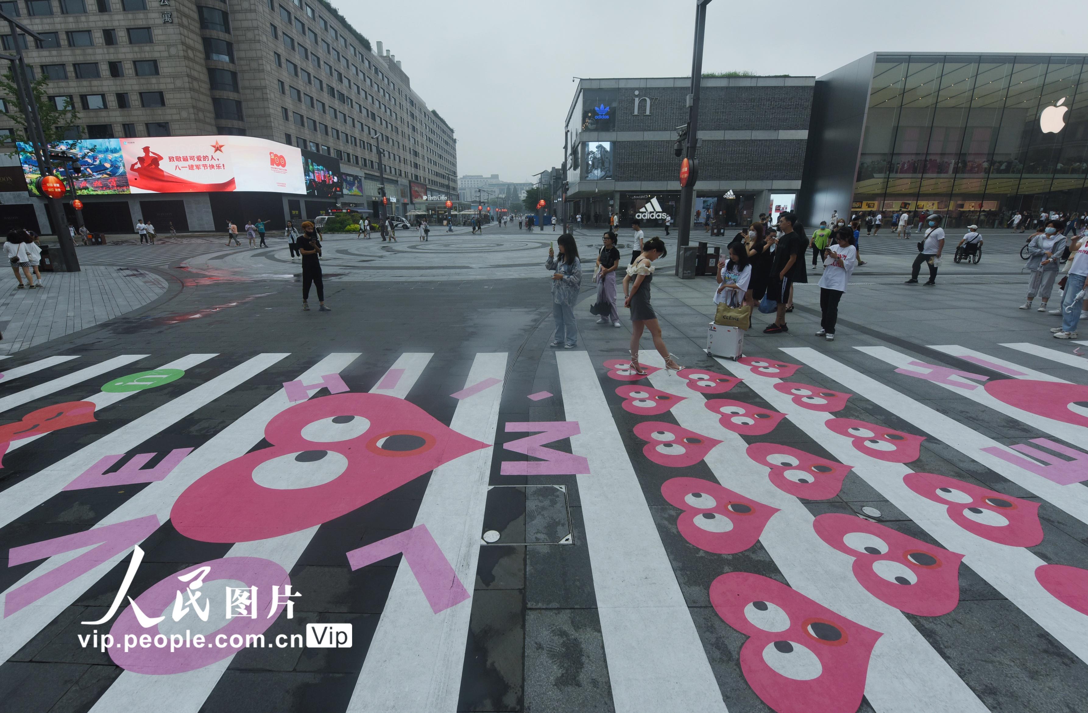 近日,随着中国传统情人节“七夕”即将到来,位于杭州西湖边上的湖滨步行街上出现了一条长约20米的“爱心”斑马线,斑马线上画满了各种粉色的爱心图案,吸引了不少市民游客特别是年轻人前来拍照打卡。龙巍摄(人民图片网)
