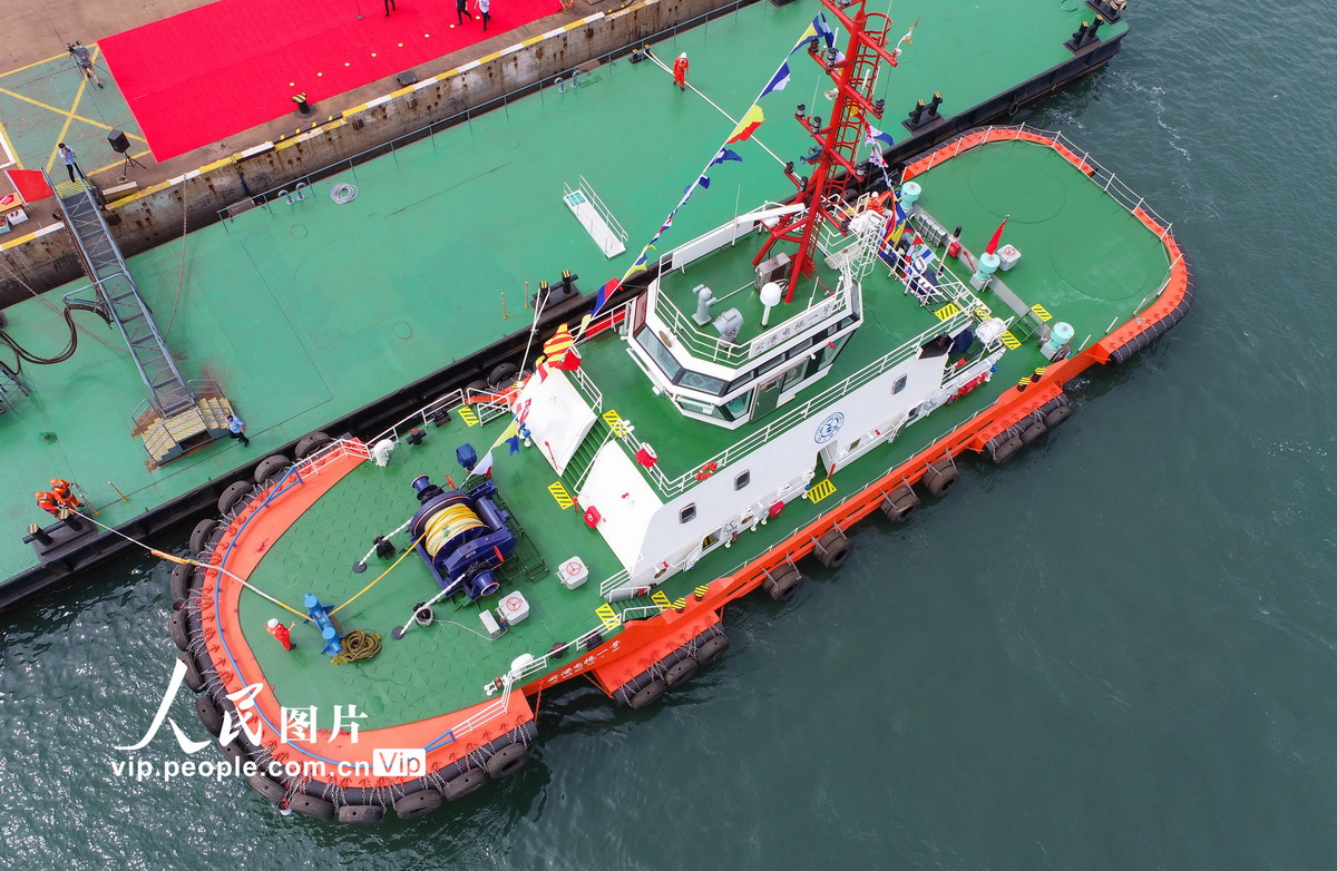 2021年8月16日,国内首艘纯电动拖轮——“云港电拖一号”在江苏连云港港投入运行。该拖轮采用磷酸铁锂电池组作为动力源,能够达到4000马力常规拖轮使用效果,可完全替代传统大功率燃油拖轮,实现大气污染物零排放,填补了国内大功率绿色低碳港口作业拖轮的空白。由连云港港口控股集团轮驳分公司承建的该电动拖轮总长35.5米,型宽10米,型深4.5米,吃水3.5米,总电量设计为5000千瓦时。据测算,该电动拖轮每年可以节约燃油消耗300吨左右,每年将可减排约900吨碳氧化物,相当于400多辆小汽车的减排量。王健民摄(人民图片网)
