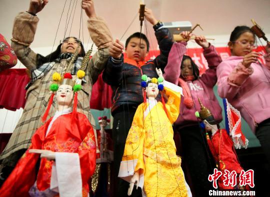 12月13日,江西省泰和县上模初中,非遗传承人蔡定礼正在为学生表演客家提线木偶技艺。泰和客家提线木偶戏是江西省泰和县上模乡颇具特色的民间戏曲艺术,集唱、做、念、打和奏乐于一身,融会了雕刻、服装、表演、剧本、音乐诸元素,曲调粗犷朴实、唱腔通俗易懂、音乐可塑性大、表演可观赏性强,具有浓郁的生活气息和民俗风味,是百姓喜欢的民间艺术瑰宝。