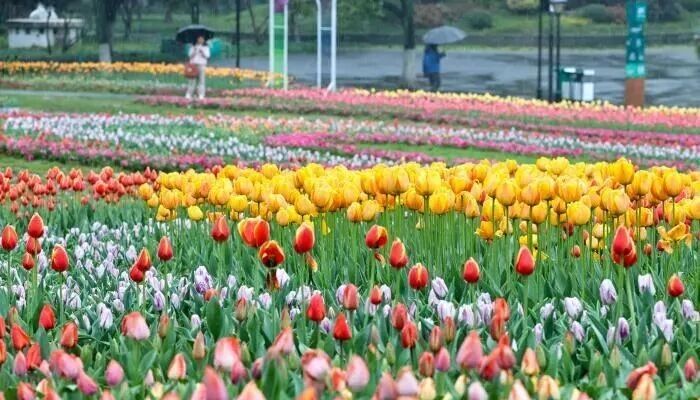 3月17日,湖北武汉,在汉口解放公园里,郁金香竞相绽放。游客雨中赏花,别有一番风味。