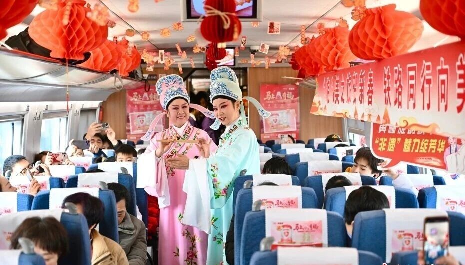 2月2日,在G8341次列车上,中国铁路上海局集团有限公司合肥客运段组织文艺小分队,在移动的车厢里开展一场以“民俗文化进车厢,新春祝福送旅客”为主题的文艺活动。