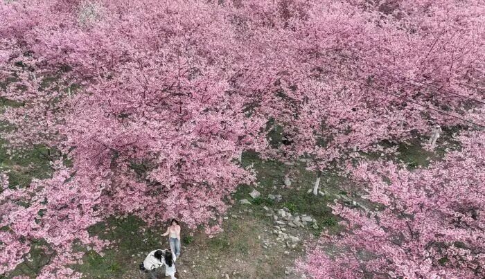 2月24日,游客在樱花园里拍照。近日,随着气温回升,贵州省黔南布依族苗族自治州贵定县盘江镇的樱花、油菜花竞相绽放,吸引不少游客前来踏春赏花。