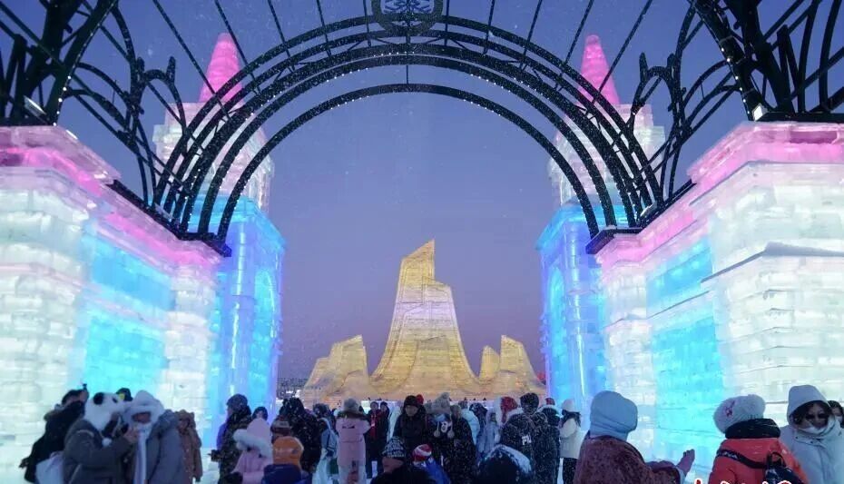 1月5日,第42届中国·哈尔滨国际冰雪节在冰雪大世界开幕。本届冰雪节以“冰天雪地,共创未来”为主题,推出十大冰雪旅游精品线路,举办200余项冰雪文化、体育和经贸活动,活动当天,游客们在哈尔滨冰雪大世界内赏冰雕美景度冰雪节。图为游客在冰雪大世界内游玩。