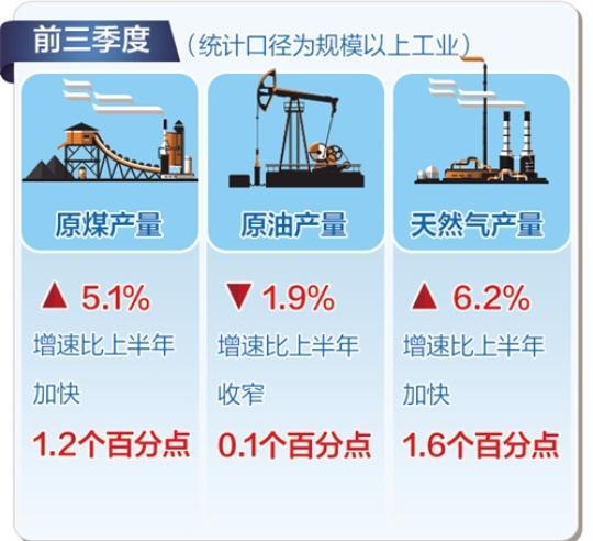 前三季度(统计口径为规模以上工业),原煤产量同比增长5.1%,增速比上半年加快1.2个百分点;原油产量下降1.9%,收窄0.1个百分点;天然气产量增长6.2%,加快1.6个百分点;电力生产延续上半年较快增长态势,发电量增长7.4%。其中,水电、核电、风电、太阳能发电等清洁能源发电量增长8.9%,高于全部发电增速1.5个百分点,占全部发电的比重为26.7%,比上年同期提高0.4个百分点。