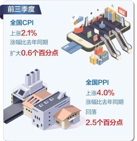 前三季度,全国CPI上涨2.1%,涨幅比去年同期扩大0.6个百分点。总体上看,前三季度2.1%的同比涨幅属于温和上涨。