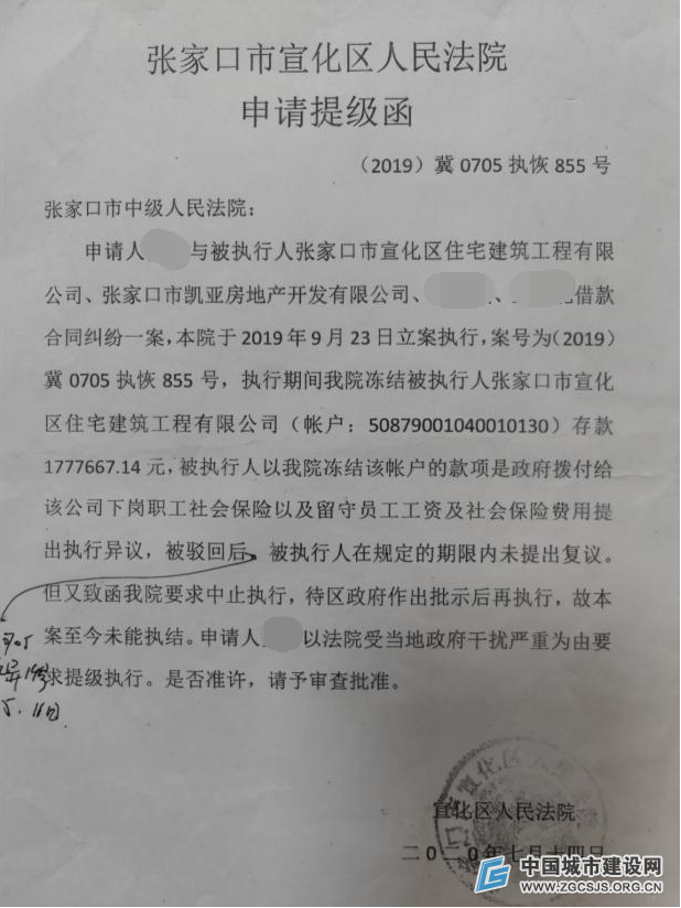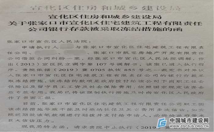 2020年7月1日,张家口市宣化区住房和城乡建设局给宣化区人民法院发函内容:“该冻结的款项是政府拨付给住建公司下岗职工社会保险及留守员工工资及社会保险费用,依照国家规定该资金应专款专用。我局已将该强制执行措施及时向宣化区人民政府作出了书面汇报。目前,住建公司职工因冻结措施导致不能及时缴纳社保及其其他费用多次信访,如贵院近期就该笔款项进行划拨支付给申请人,必将给政府带来巨大信访压力。现我局特去函,请求贵院中止执行(2019)冀0705执恢855号之一裁定书,并暂缓将已冻结的住宅公司资金划拨给申请执行人。建议贵院待区政府作出批示后再进行处理。”