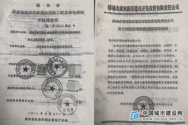 从韩城市黄河新区建设开发投资有限公司(韩城市城市投资集团有限公司下属公司)下发给苏州姑苏市政园林建设有限公司“关于何阳街等市政道路建设的函”(2018年6月15日发)内容所知,韩城市黄河新区建设开发投资有限公司代建的“金盆街”9条道路建设工程已于2018年1月8日进行公开招标,告知苏州姑苏市政园林建设有限公司2018年5月30日通过公示中标,并发放《中标通知书》。