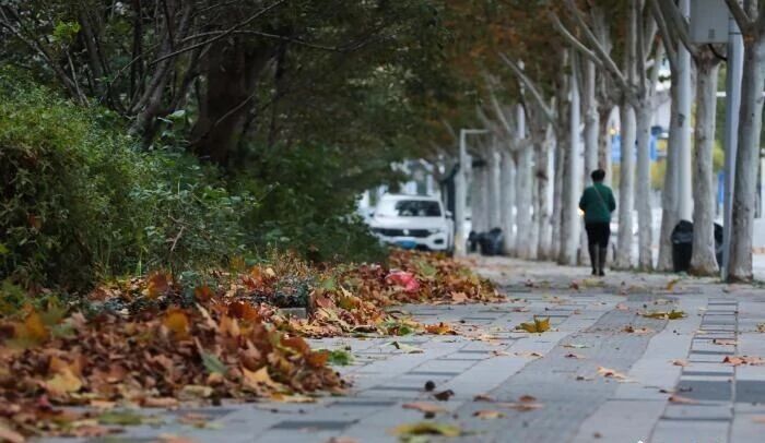 11月17日,受寒潮影响,湖北武汉遭遇大风降温天气。图为市民在街头出行。