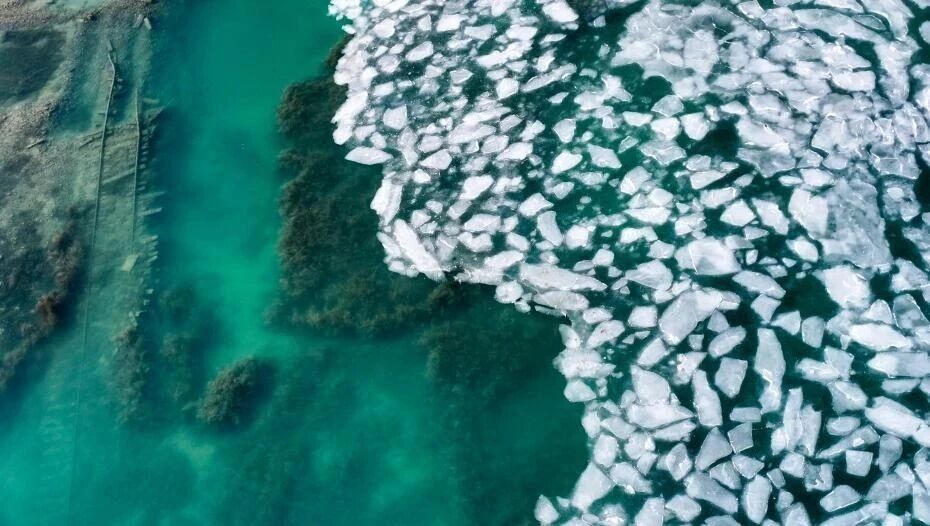 12月16日,青海省海南州,冬日青海湖冰推景观吸引游客驻足拍照,定格“高原蓝宝石”冬日美景。图为航拍青海湖冰推景观。